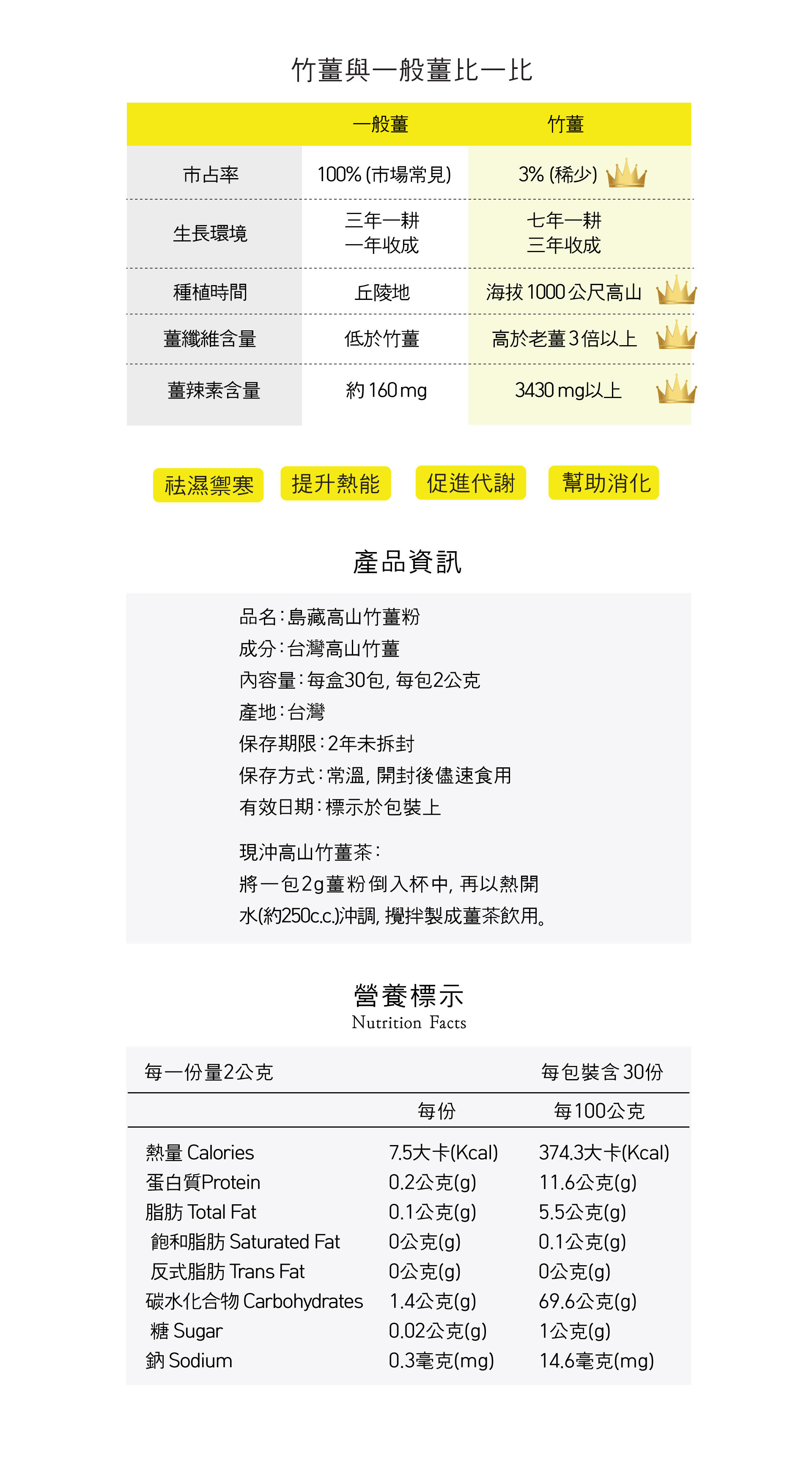 一盒30包,市面罕見2g隨身包。嚴選台灣高山頂級竹薑。